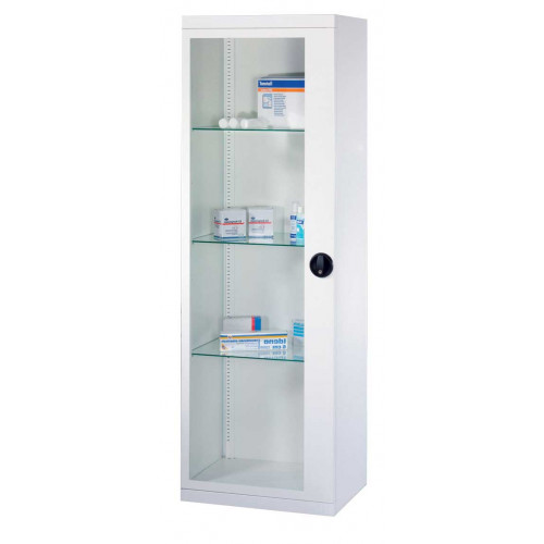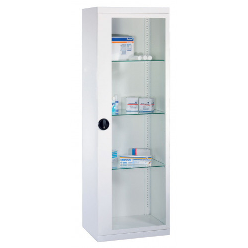 À l’intérieur, l’armoire est dotée de trois étagères en verre. Ces étagères sont conçues pour supporter des charges importantes tout en restant faciles à nettoyer. Leur matériau est résistant aux agents désinfectants couramment utilisés dans les établissements de santé, assurant ainsi une hygiène impeccable. La présence de ces étagères modulables permet d’organiser de manière efficace le matériel en fonction des besoins spécifiques, avec la possibilité d’adapter les espaces selon la taille et la quantité des objets stockés.
