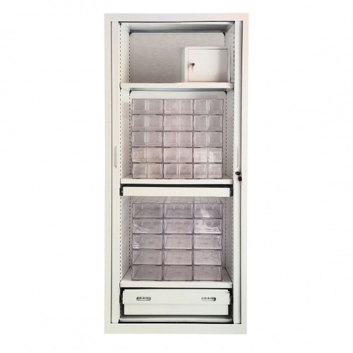 | Équipements | 3 étagères + 1 coffre + 1 plan de consultation + 1 bac télescopique + 15 M 5000C + 15 M 5000A + étiquettes |