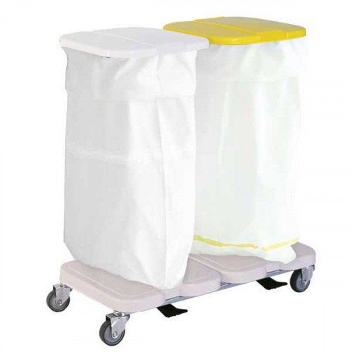 Ce chariot à linge sale est conçu pour accueillir deux sacs. Il est livré avec deux couvercles préinstallés, un jaune et un blanc. Ce chariot facilite la gestion du linge sale au sein des établissements de santé. Il est équipé de deux poteaux et de deux porte-sacs en aluminium anodisé. Chaque couvercle, à ouverture indépendante, est actionné par une pédale. Les quatre roues doubles sous le socle offrent une excellente mobilité au chariot.