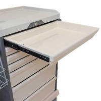 Le chariot est équipé d’une tablette latérale située à droite, offrant un espace supplémentaire idéal pour poser des documents, instruments ou accessoires fréquemment utilisés. Cette tablette améliore l’ergonomie et la praticité du chariot, permettant aux utilisateurs de garder à portée de main les éléments indispensables sans encombrer les niveaux de rangement principaux.