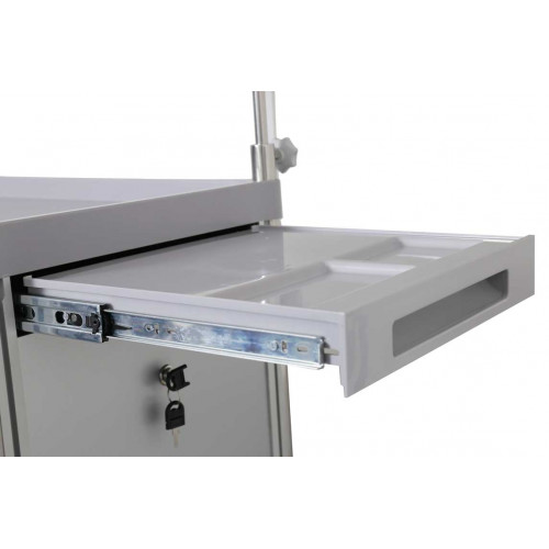 - Équipement standard : 2 rangées de 5 bacs basculants, 1 panier filaire, 1 support boîte à aiguilles, 1 support boîte à gants, 1 tablette coulissante, 1 serrure centrale à clé, 2 poubelles, 3 jeux de séparateurs en polycarbonate pour tiroirs