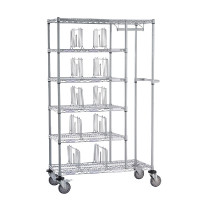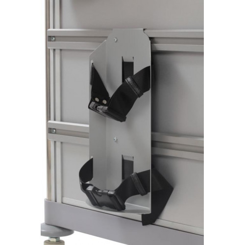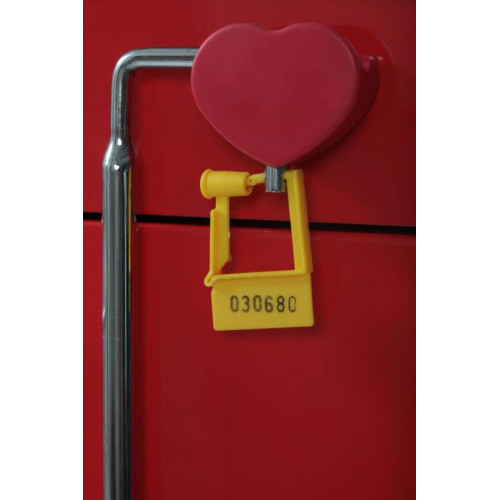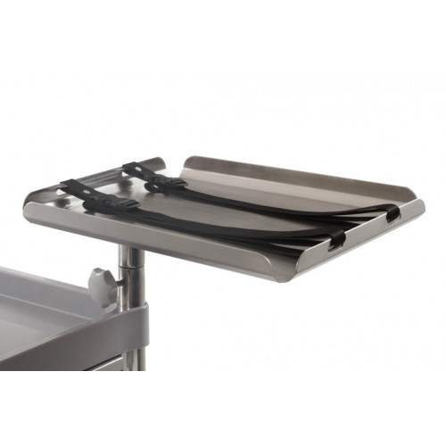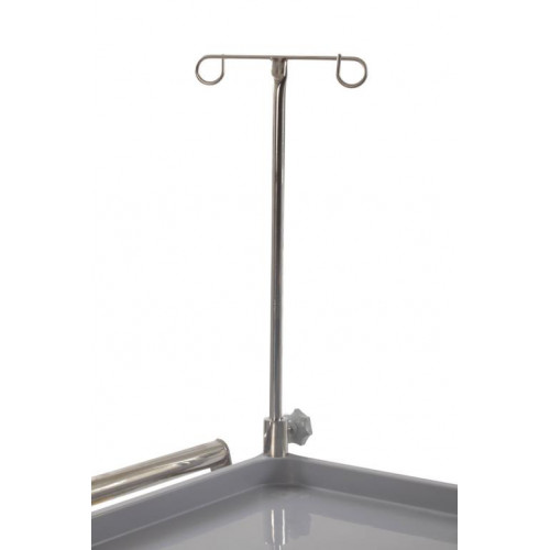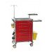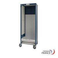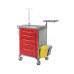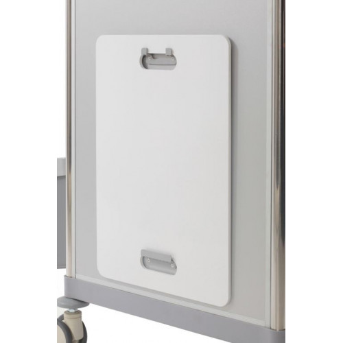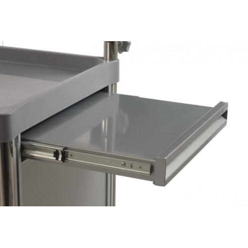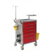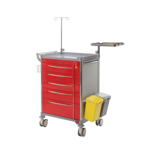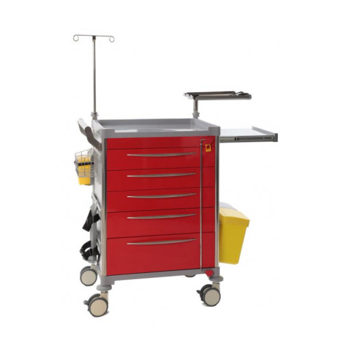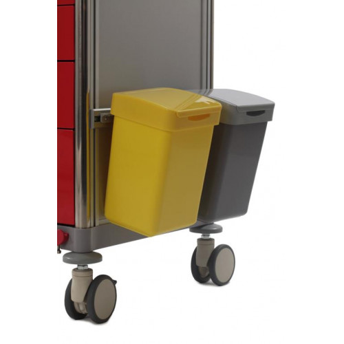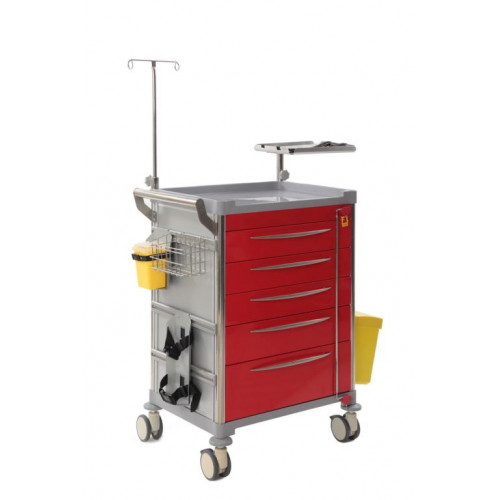 - Equipement standard : 1 panier filaire, 1 support boîte à aiguilles, 1 support oxygène (max. 6 litres), 1 support sondes, 1 planche à massage cardiaque, 1 tablette coulissante, 1 porte défibrillateur, 2 poubelles, 3 jeux de séparateurs en polycarbonate pour tiroirs, 1 fermeture manuelle avec 50 scellés
