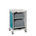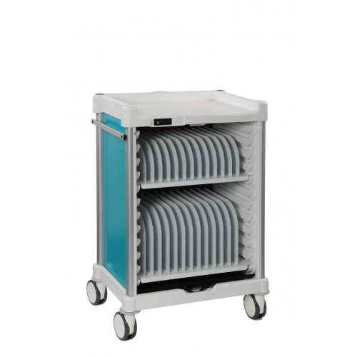 Le chariot peut accueillir jusqu’à 12 plateaux plumiers ou 2 étagères avec intercalaires aux formats A4 et A3 grâce à des glissières conformes à la norme ISO 600x400. Les glissières sont équipées d’un système de retenue fiable qui empêche la chute des bacs et plateaux lors des déplacements, assurant la sécurité du personnel et du matériel transporté.