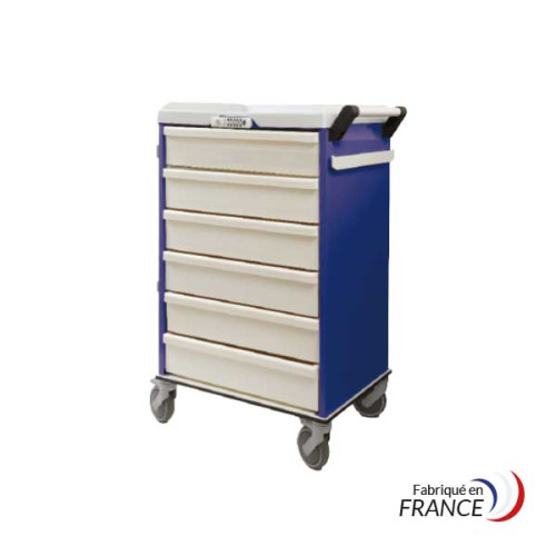 Ce chariot NOVELO ESCARGOT est conçu pour la gestion de 36 résidents en établissement de santé. Ce chariot est doté d'une centralisation par code électronique pour assurer une gestion sécurisée des stocks, ainsi que d'une poignée de guidage à droite pour une manœuvrabilité optimale.