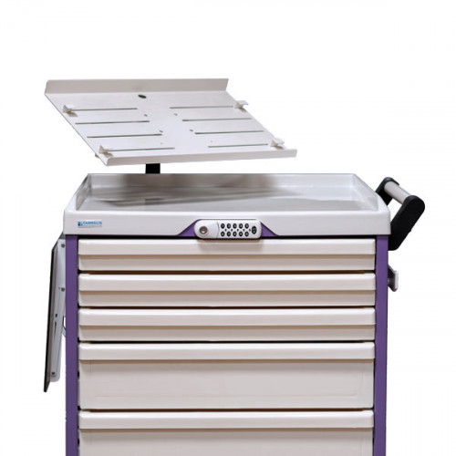 This computer and tablet holder is designed for Farmalis by Mdose healthcare carts. It offers a secure solution for the installation of a laptop or touch-screen tablet. Adjustable in inclination and height, this rotating stand adapts to the individual needs of each member of the medical team, guaranteeing optimum comfort of use.