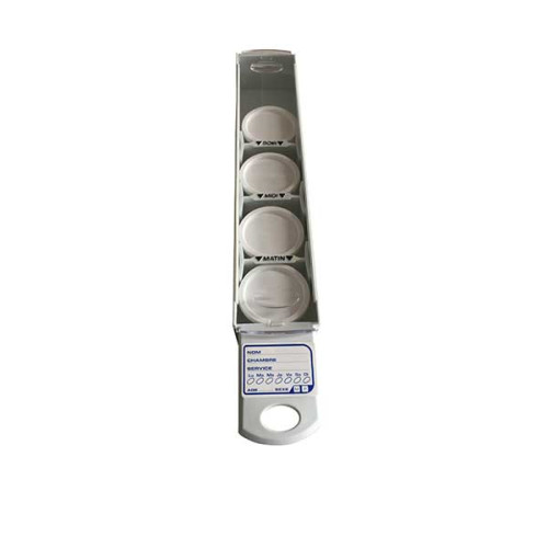 This pill dispenser for hospital use has 4 removable dividers with embossed letters for morning, noon, evening and night.