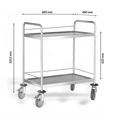 This model features two spacious shelves, each equipped with sturdy peripheral rails. These rails play a crucial role in securing items placed on the shelves, preventing them from falling during trolley movement. They also make handling easier by providing additional support for grip, enhancing stability and user comfort. The raised edges, combined with the rails, ensure optimal protection of the transported contents.