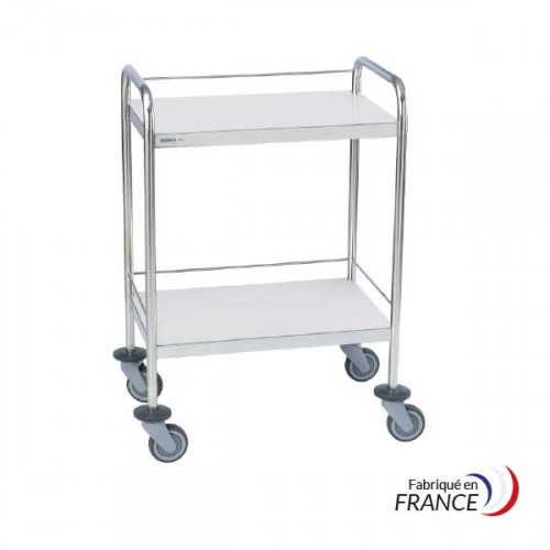 Ce modèle est fabriqué en acier inoxydable de haute qualité, garantissant une excellente résistance à la corrosion, aux chocs et aux produits désinfectants. Il dispose de deux plateaux de dimensions 600 x 400 mm, entourés de 4 galeries de protection (2 sur les côtés 600 mm et 2 sur les côtés 400 mm) afin d’éviter la chute du matériel. Les poignées ergonomiques intégrées facilitent la manipulation du chariot.