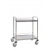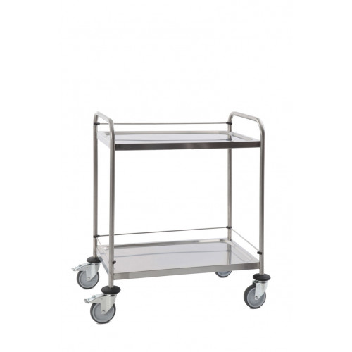 Guéridon en acier inoxydable avec deux grands plateaux et galeries latérales, livré à monter pour un usage professionnel polyvalent.