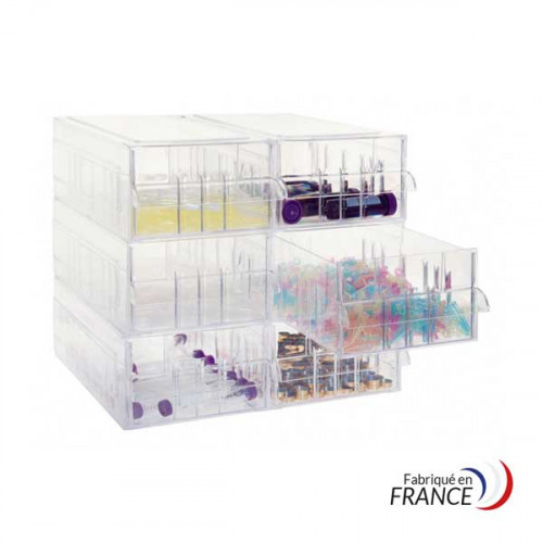 Ces tiroirs plastiques sont modulables à volonté et solidaires par tous les cotés. Vous pourrez les placer dans des armoires ou sur des étagères.